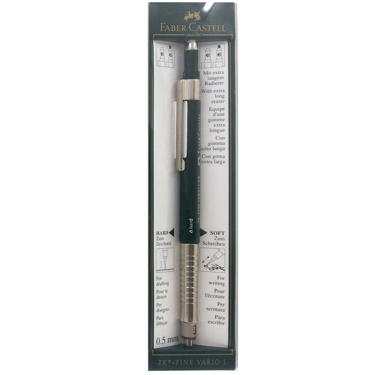 Yazım ve çizim için Yumuşak/Sert ayarı yapılabilen mekanizmalı metal uç kısım Uç sertliğini gösteren uç kısımdaki pencere Uç kalınlığını gösteren uç kısım rengi Uç kalınlığı: 0.5 mm